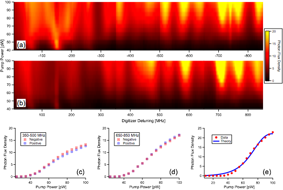 In the first experiment in the above series [L2], we further studied the dynamics of parametric oscillations associated with the photon generation. A driven parametric oscillator can exist in a number of qualitatively different dynamical states. We observed all of the states predicted by theory and demonstrated good quantitative agreement between the theoretical predicted and experimentally observed characteristics. We also observed switching of the oscillator between the various dynamical states. These results were an important verification of the general theory of strongly-driven nonlinear systems subject to noise. An enabling step in all of this work was the development of a new technology that continues to enable many fruitful applications in circuit QED (cQED) and elsewhere: tunable superconducting transmission-line resonators [L13]. Tunable resonators with the same architecture have been used by Dr.Wilson’s team and others to make quantum-limited parametric amplifiers and as coupling buses for superconducting qubits.