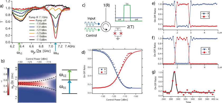 The work started with a set of experiments studying the strong coupling of a single artificial atom to an open transmission line. This produces an almost ideal 1D quantum electrodynamic system. Those first experiments demonstrated a number of interesting physical effects. For instance, we demonstrated that the coherent scattering of single photons from the atom leads to the strong extinction (>99%) of the transmitted light, an effect long predicted but never observed in conventional quantum optics [L14]. (This effect was first observed in the same year by Astafiev et al. at NEC.) In the same work, we demonstrated, for the first time, a rudimentary single-photon router in the microwave regime [L14], an important building block for future quantum networks.